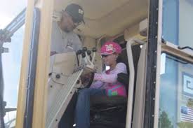 توصیف یک صحنه: دختر نابینایی را تصور کنید که در کابین جلو یک لودر نشسته است و در محل یک پروژه ساختوساز حضور دارد. اپراتور لودر در نزدیکی کابین ایستاده است و دختر را تشویق میکند تا دستش را دراز کند و دستگیرهها و اهرمهای مختلفی که ماشین را کنترل میکنند، بررسی کند.